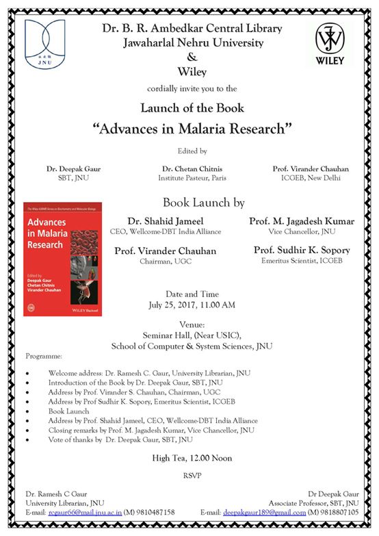 Event End Date 25/07/2017 Event Title Library is organising Launch of the book "Advances in Malaria Research" Event Details Library is organising Launch of the book "Advances in Malaria Research" on 25th July, 2017.