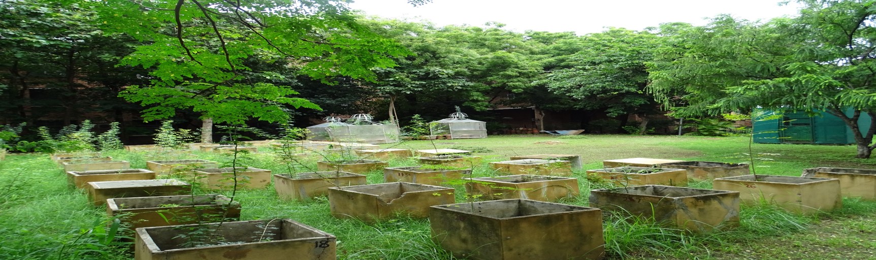 The garden of School of Environmental Sciences is made for various experimental work in the field of Ecology and for Bioremediation. Competitive interactions of plant species Acacia leucophloea, Azadirachta indica and Prosopis juliflora is being observed in Garden of SES. For this purpose, observations on gradients of Nutrient, Moisture and Temperature are monitored on combination of these three species and their replicates. Nutrient and moisture gradients are maintained manually, temperature gradient is maintained with the help of three open top chambers along with the controls. The garden of School of Environmental Sciences is made for various experimental work in the field of Ecology and for Bioremediation. Competitive interactions of plant species Acacia leucophloea, Azadirachta indica and Prosopis juliflora is being observed in Garden of SES. For this purpose, observations on gradients of Nutrient, Moisture and Temperature are monitored on combination of these three species and their replicates. Nutrient and moisture gradients are maintained manually, temperature gradient is maintained with the help of three open top chambers along with the controls.